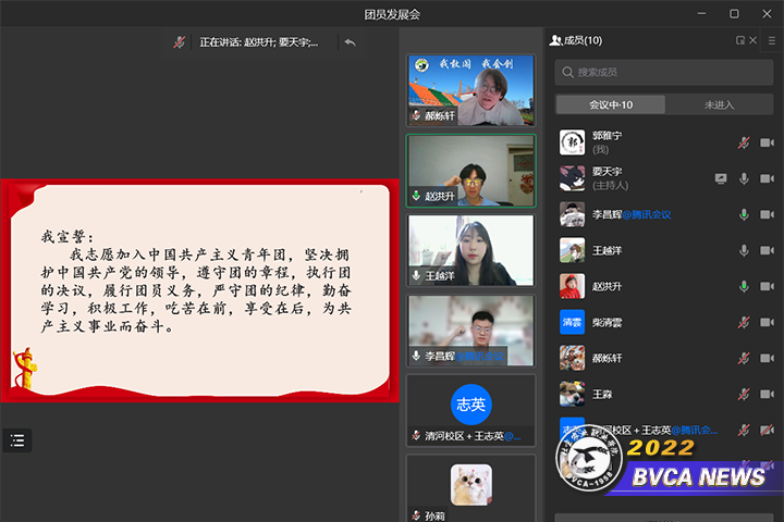 受疫情影响,本次入团仪式采用线上形式。会前一周,团总支老师与装备2111班团支书共同设计发展仪式,反复排练流程,力求让新团员感受到线上发展会同样庄重。会上,李昌辉、王越洋、赵洪升三名同学,分别宣读了《入团志愿书》,在介绍人介绍意见后,全票通过。辅导员王志英老师和班主任孙莉老师对新团员的加入表示了祝贺,并勉励他们要在日后的学习、工作中更加努力,要有更高的追求。