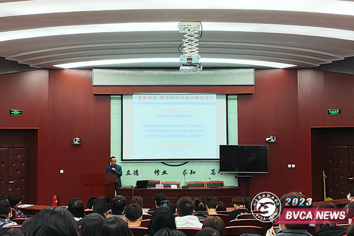 4月24日晚上,华南农业大学兽医学院博士生导师、中国畜牧兽医学会小动物医学分会副秘书长、广东省畜牧兽医学会小动物医学分会会长、广东宠物行业职业教育战略联盟副理事长石达友教授应邀来我系作职业生涯规划和执业兽医师考试专题讲座。系学办主任沈杰主持讲座,学办辅导员、在校学生近260余人参加。