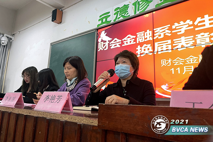 系党总支书记李艳芳做总结发言,充分肯定了上届学生会的工作成绩,对新一届学生干部表示祝贺并提出殷切希望。号召同学们全力支持学生干部工作,在和谐宿舍创建、校园疫情防控、垃圾分类等各项工作中群策群力,维护好财金系优良的系风学风。特别强调,学习是第一要务,希望学生干部们珍惜在校时间,锻炼自己的综合素养,为将来就业打下基础。
