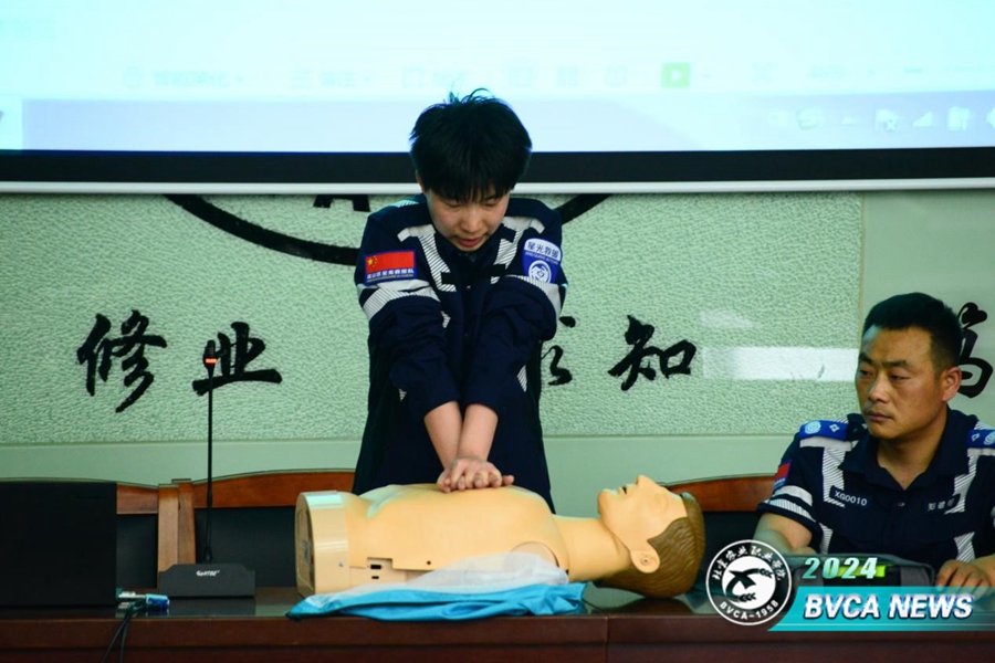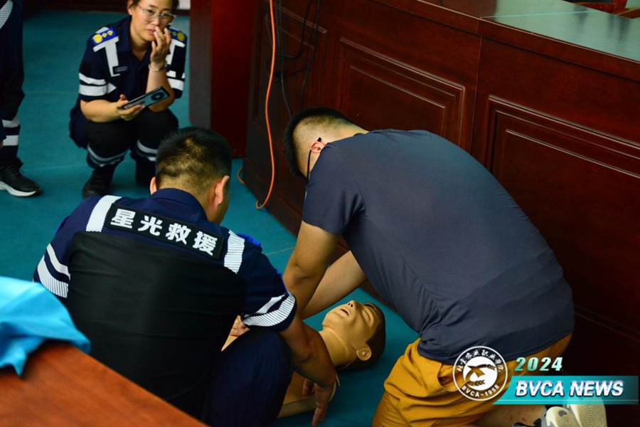 随后,房山区星光救援队的成员向大家示范讲解了心肺复苏的操作方法。在救援队员的现场指导下,学生使用假人进行实操急救技巧。