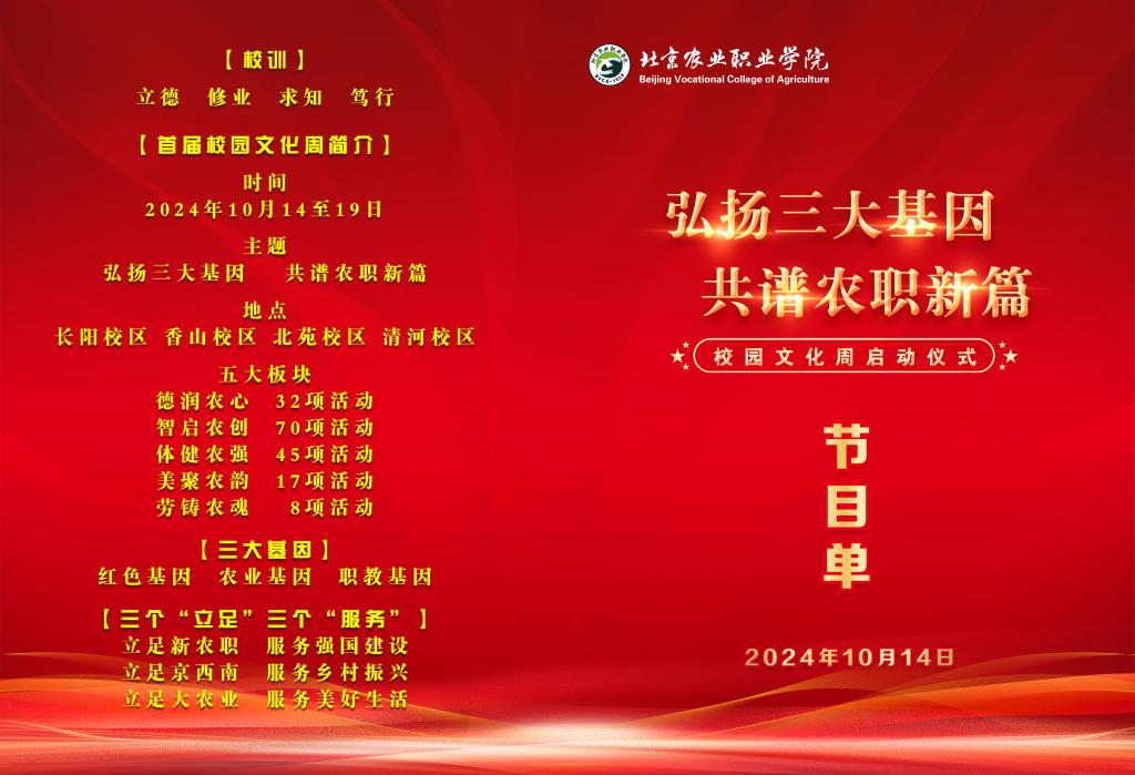 10月14日上午,学校“弘扬三大基因 共谱beat365新篇”校园文化周启动。学校党政领导、四校区师生、离退休教职工和京宛合作南阳农业职业学院师生代表通过现场和视频直播形式参加。
