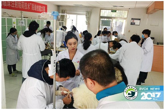 此项大赛共有208名学生报名参加,经过初赛、复赛的层层选拔,最终有20名学生过关斩将,进入决赛。决赛共分5个组,每组4人,抽签决定组次,比赛时间60分钟。各组学生需要相互配合,共同完成犬的前臂头静脉、颈静脉、后肢隐静脉的位置绘图,犬的各项生理指标测量等6项任务,其中个人单独完成给犬的皮下、肌肉注射、埋置留置针等3项操作任务。比赛内容既体现了对参赛选手理论知识与动手技能的考核,也体现了团队协作能力的考察。