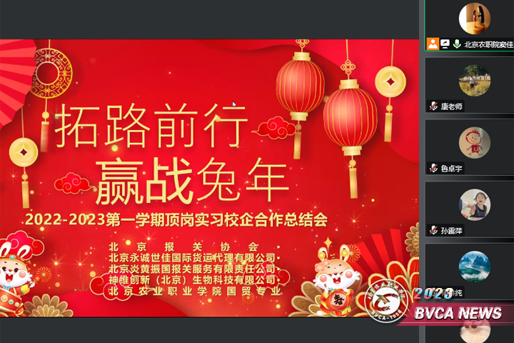 1月6日,经济管理系国贸专业举办“拓路前行 赢战兔年”顶岗实习总结会,邀请北京报关协会领导与会员单位共同在线上交流“行-校-企”共同体合作办学经验。经管系主任朱京燕、副主任杜一馨到会,国贸专业全体师生共62人参加。