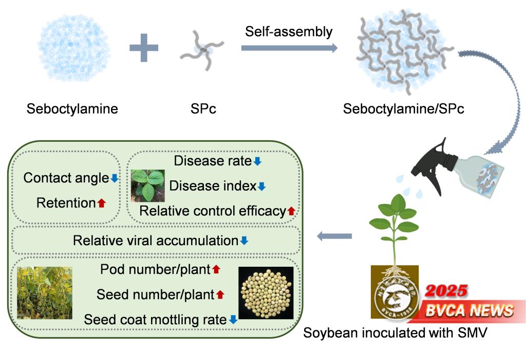 该研究成功设计开发了一种具有强粘附性能的自组装纳米抗病毒农药,大幅改善了农药的理化性质并提升农药分子的递送效率,显著提升了大豆花叶病毒(SMV)的田间防治效果,为SMV的防治提供了新的方法策略。