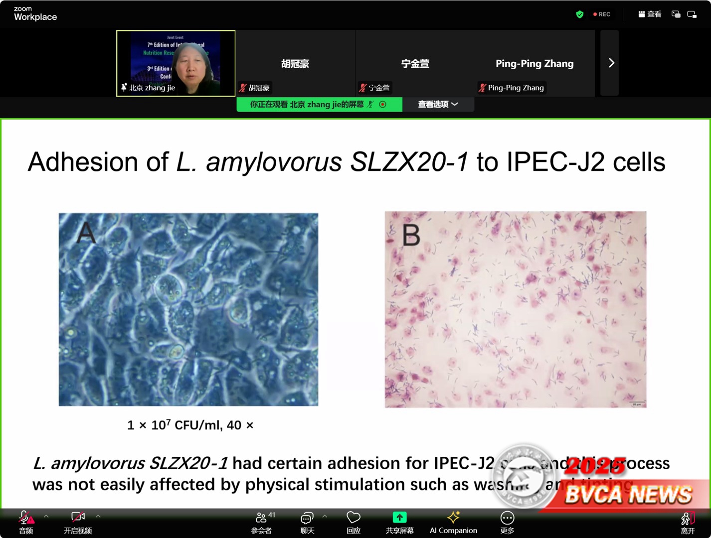 张洁教授在大会上作了题为“A novel probiotic candidate strain,Lactobacillus Amylovorus SLZX20-1, enhances intestinal function through enzyme production and modulation of the gut microbiota”(一株新型嗜淀粉乳杆菌通过其产酶能力增强肠道功能并调节肠道菌群组成)的学术报告,系统介绍了一株新型嗜淀粉乳杆菌的最新研究结果。