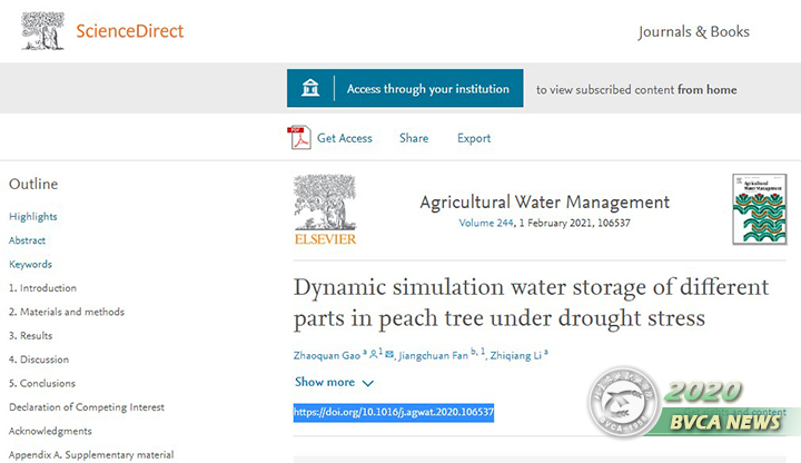近日,我院园艺系高照全副教授等人在《Agricultural Water Management》在线发表题为《Dynamic simulation water storage of different parts in peach tree under drought stress》的研究论文(https://doi.org/10.1016/j.agwat.2020.106537)。