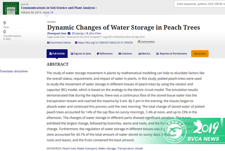 日前,园艺系高照全老师等人所作的“Dynamic Changes of Water Storage in Peach Trees”一文被国际重要期刊“Communications in Soil Science and Plant Analysis”接受刊发。