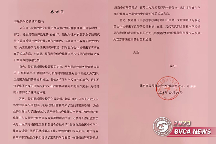 11月13日,北京亦辰园果蔬专业合作社总经理陈山山女士到现代服务管理系赠送锦旗和感谢信,表达对学院及现代服务管理系教师团队的感谢。