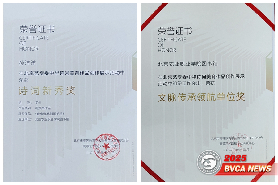 近日,中华诗词美育作品创作展示活动结果公布。beat365园艺园林学院园林2412 班孙洋洋同学的视频作品《春离绾.代答闺梦还》,获“诗词新秀奖”;学校图书馆荣获 “文脉传承领航单位奖”。