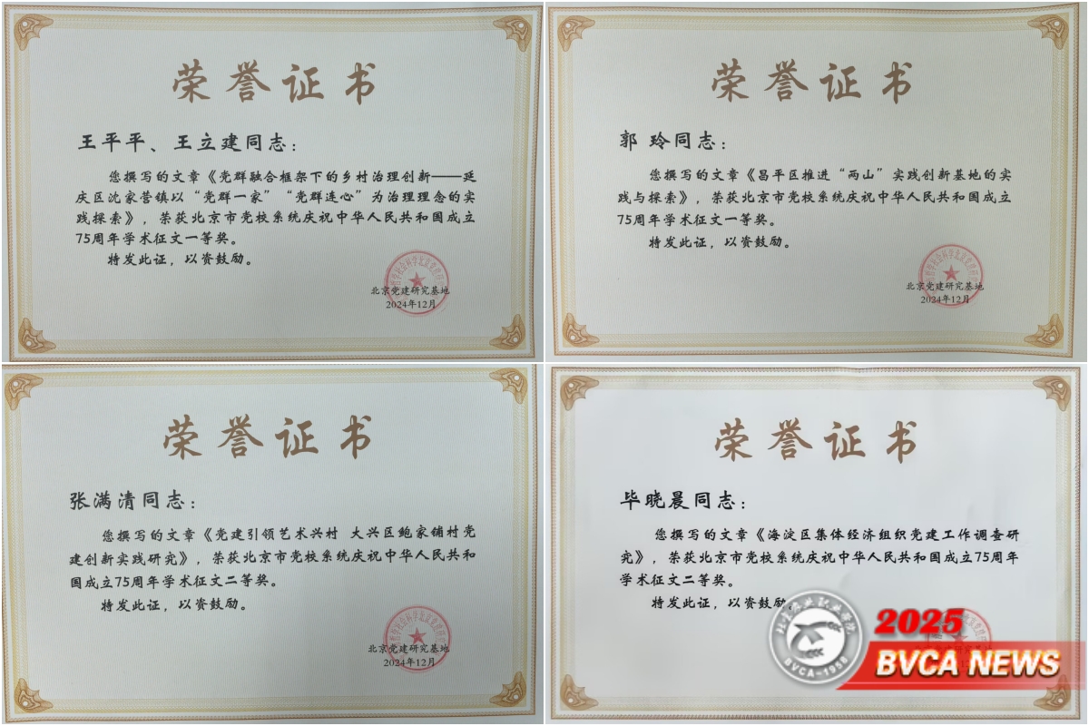近日多项科研成果获市级奖项,在理论研究方面,郭玲、王平平、王立建、张满清、王丽娟、毕晓晨撰写的4篇论文,在北京市党校系统庆祝中华人民共和国成立75周年学术征文评选中斩获两个一等奖和两个二等奖。文章立足党建工作与北京农村工作实际,深入剖析基层党组织功能建设,提出针对性的对策建议,实现了理论研究成果的新突破。