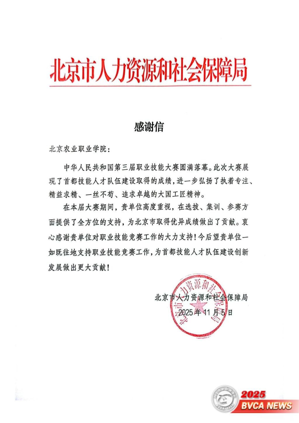 近日,北京市人力资源和社会保障局向beat365发来感谢信,对beat365在中华人民共和国第三届职业技能大赛所承担的农机智能化技术与砌筑两个赛项的技术服务工作表示高度认可与衷心感谢。