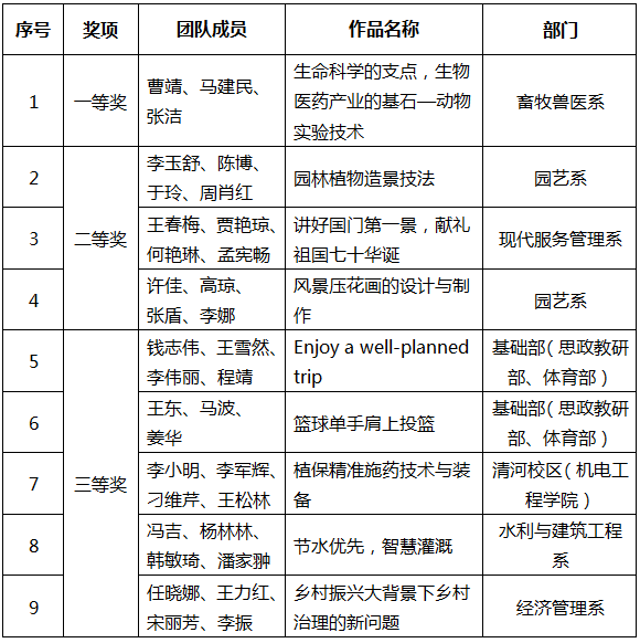 9月27日,北京市教育委员会发布《关于公布2019年北京市职业院校教学能力比赛获奖结果的通知》(京教函【2019】509号)。此次比赛中,我院参赛教师团队荣获一等奖1项、二等奖3项、三等奖5项。其中,畜牧兽医系曹靖、马建民、张洁团队获得一等奖并作为12支团队之一代表北京市参加2019年全国职业院校教学能力比赛。同时学院获得优秀组织奖。
