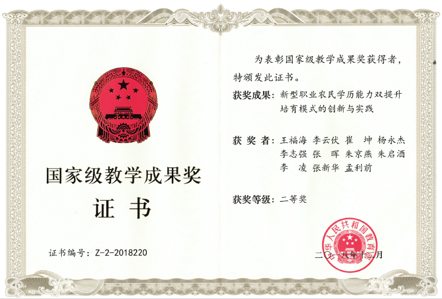 近日,教育部发布《关于批准2018年国家级教学成果奖获奖项目的决定》。我院《新型职业农民学历能力双提升培育模式的创新与实践》项目荣获职业教育类二等奖。