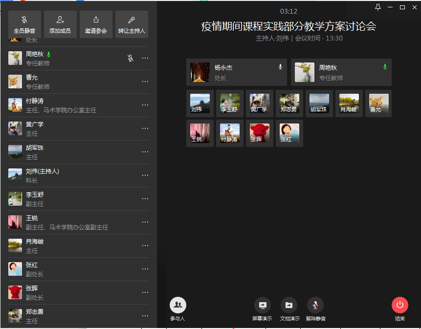 教学过程中,由于存在大量的实践教学内容,在学生不能到校,不能进行亲手操作的情况下,实践教学内容怎样完成,成为教学管理部门感到棘手的问题。为更全面了解情况,解决问题,4月14日下午,教务处组织部分专业教师,通过企业微信音频会的形式,召开了疫情期间课程实践教学内容讨论会,教务处长杨永杰同志主持会议,10余名教师代表参加。