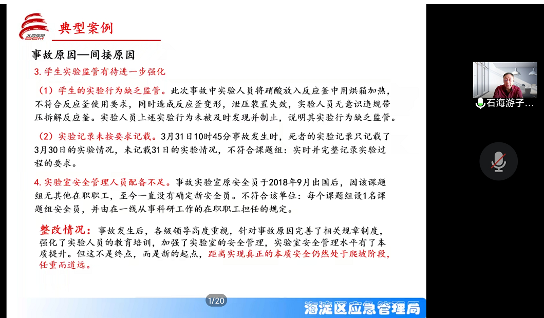 11月15日,教务处、安全稳定工作处邀请教育部实验室安全技术组专家、北京市海淀区应急管理局副局长陈溥做“高校实验室典型安全事故与原因分析”专题线上培训。学院党委常委、副书记冯学会出席并讲话,教务处、安全稳定工作处、实验实训中心和各教学单位负责人、专业(教研室)主任、教学秘书、实验(训)室管理员及相关教师180余人参加。会议由教务处杨永杰处长主持。