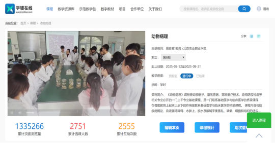 建设了与教材配套的网络课程。与教材配套的《动物病理》课程资源通过学银在线开放,被全国同类院校师生广泛使用。《动物病理》是北京市动物医学专业群教学资源库建设课程,课程资源持续更新中。
