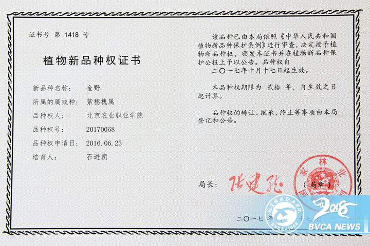 近日,我院园艺系石进朝教授选育的‘金野’紫穗槐被国家林业局授予植物新品种权(国家林业局公告,2017年第17号),这是我院第二个报审并通过授权的植物新品种(品种权号:20170068)。
