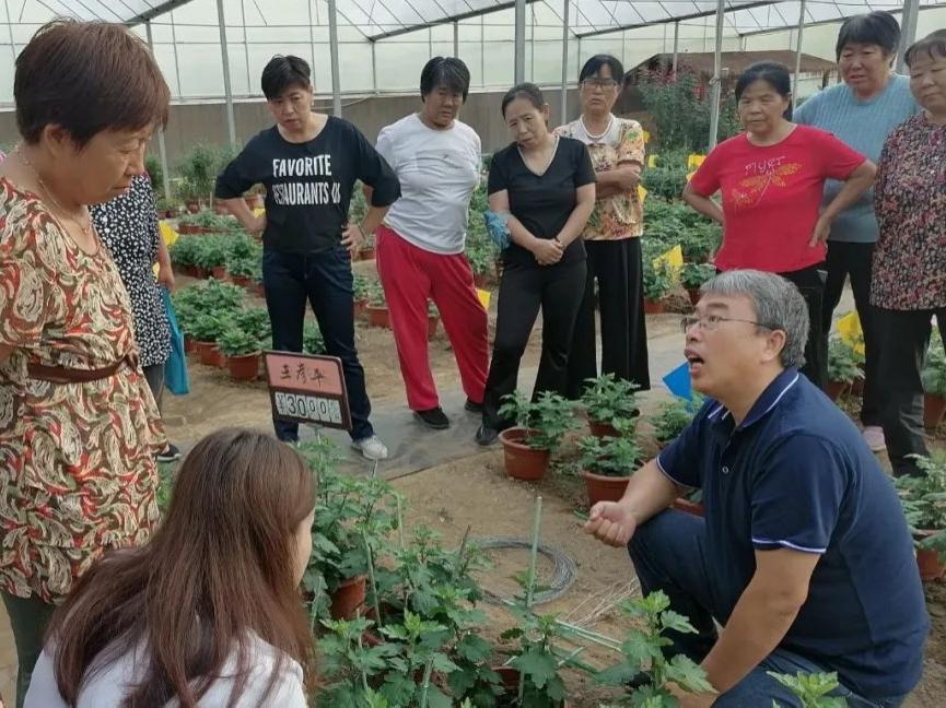 在房山区周庄科技小院,我院副教授刘旭富应邀现场为村民传授食用菊花种植课程,帮助村民进行绑枝,并对村民在种植盆栽食用菊花过程中遇到的具体情况进行答疑。相较地栽,盆栽更能吸引游客,产品附加值更高。