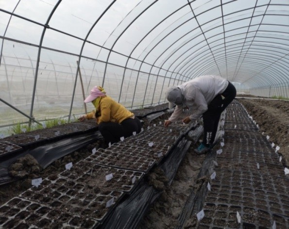 园艺系相关教师在11月下旬,根据苗情及长势分别将甜瓜定植于4个大棚中,共设3个处理,3个重复,目前长势良好,大部分品种处于3、4叶一心,恰逢甜瓜的标准定植适期。
