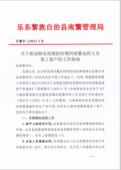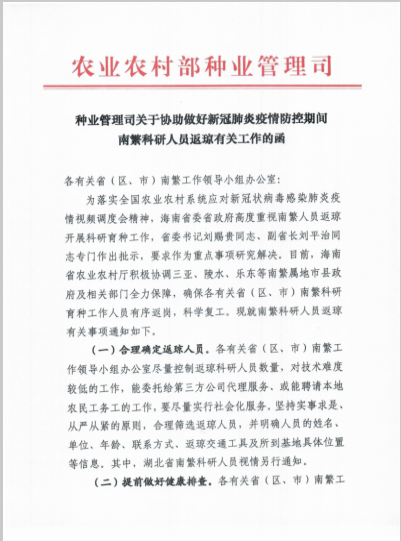 南繁新冠疫情防控形势严峻,根据农业部种业司通知要求、市农工委李志军书记的批示,北京市南繁人员返琼工作的具体要求注意以下几点: