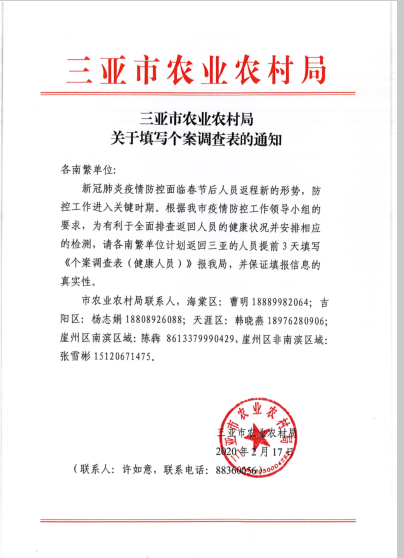 三是非必需不返琼,实行分级管理。对已申报的103人名返琼人员进行进一步筛查,明确人员性质、工作岗位、返琼任务;临时性辅助性工人,建议暂不返琼,尽量通过委托当地专业化技术服务、聘用当地人员或各单位之间协调解决。明天中午12:00前将筛查结果报北京市种子管理站袁涛。2月28日,三亚市农业农村局对南繁返琼人员实行分级管理,具体要求大家详见通知,这里不再重复。