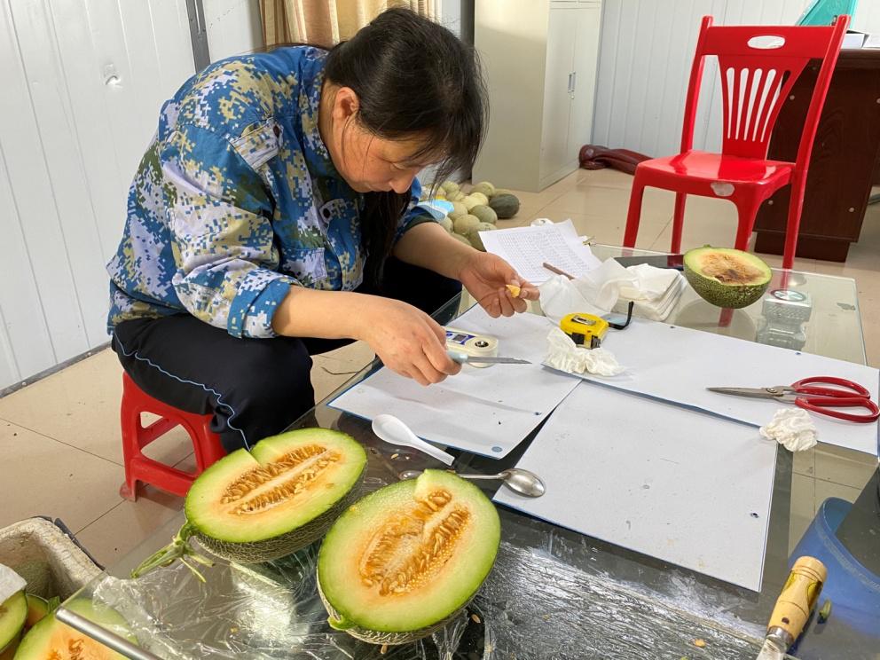 同时完成12个甜瓜品种进行品质测定及性状调查,对西甜瓜性状及病虫害情况数据调查登记。
