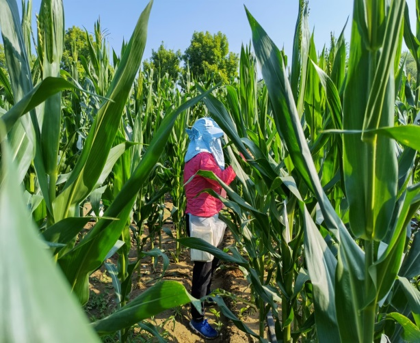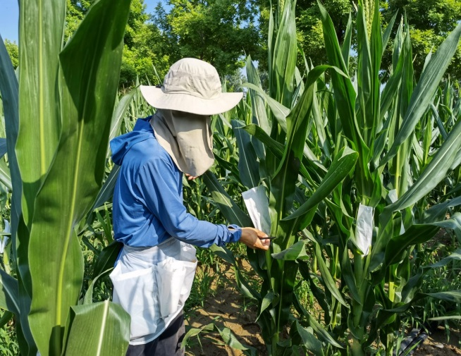 4月29日学院院内南繁基地开始春季播种,北京今年春季气温较低,早晚温差较大,播种后玉米长势较慢。直至7月6日部分品种才开始套袋,8号开始首次授粉,最近北京强对流天气较多,又进入伏期,给授粉工作带来不利影响。各位老师实时关注天气情况,克服潮湿闷热天气,开展授粉工作。本次授粉工作计划2周内完成,完成玉米授粉约8000株,并对自交系品种生长期内作物株高、性状、抗病虫害等数据进行观测记录,对现有自交系品种进行留种、提纯。
