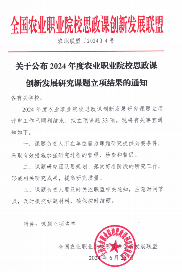 6月25日,全国农业职业院校思政课创新发展联盟公布2024年度农业职业院校思政课创新发展研究课题立项结果,我院青年教师李明珠主持的一般课题“乡村振兴背景下京西南农耕文化的活化开发研究”获得立项。