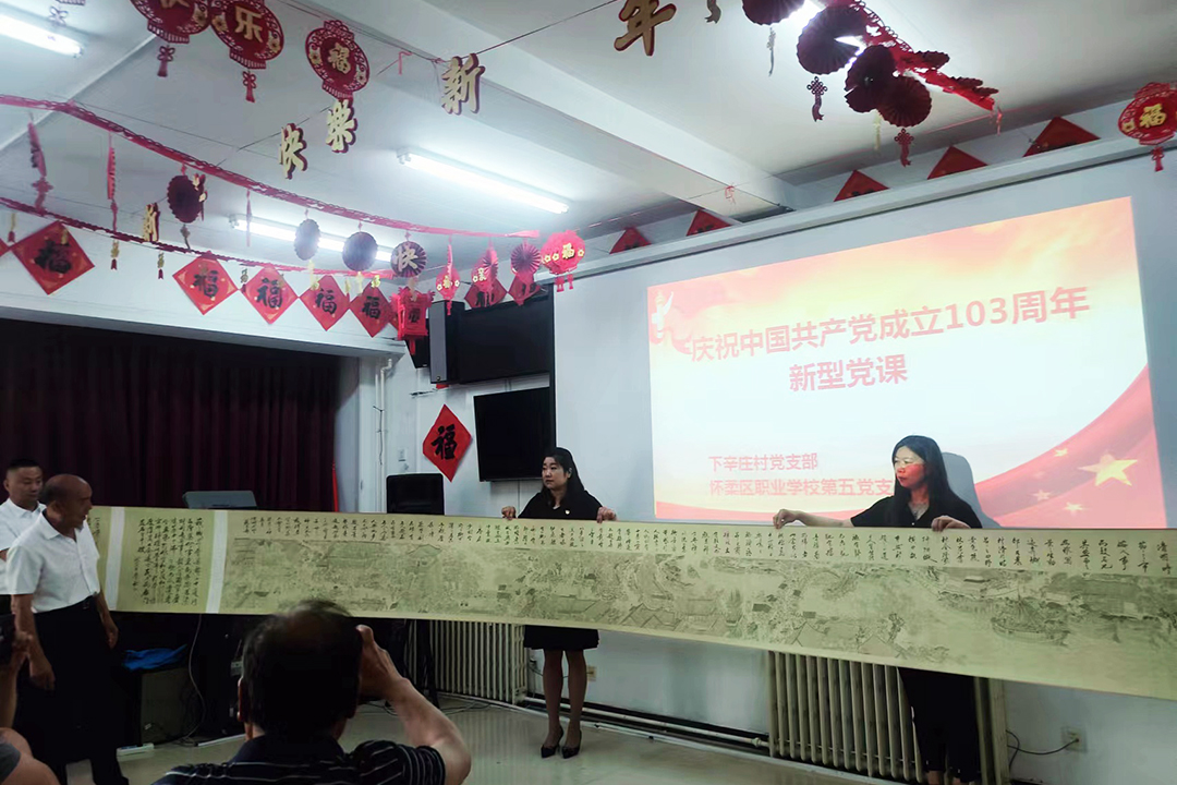 接下来的节目表演中,下辛庄村党支部三位党员诗朗诵《红船》;书画作品展示环节中,于庆国展示了自己书写的习近平总书记创作的一首词《念奴娇·追思焦裕禄》;杜淑华展示了画作《鸟语花香》;胡春林的怀素草书《自叙帖》;杨进泉的《清明上河图》尤为震撼;怀柔区职业学校第五支部党员诗朗诵《大写的中国》;最后雁之声合唱队为大家演唱《梦在春天如愿》和《我和我的祖国》。