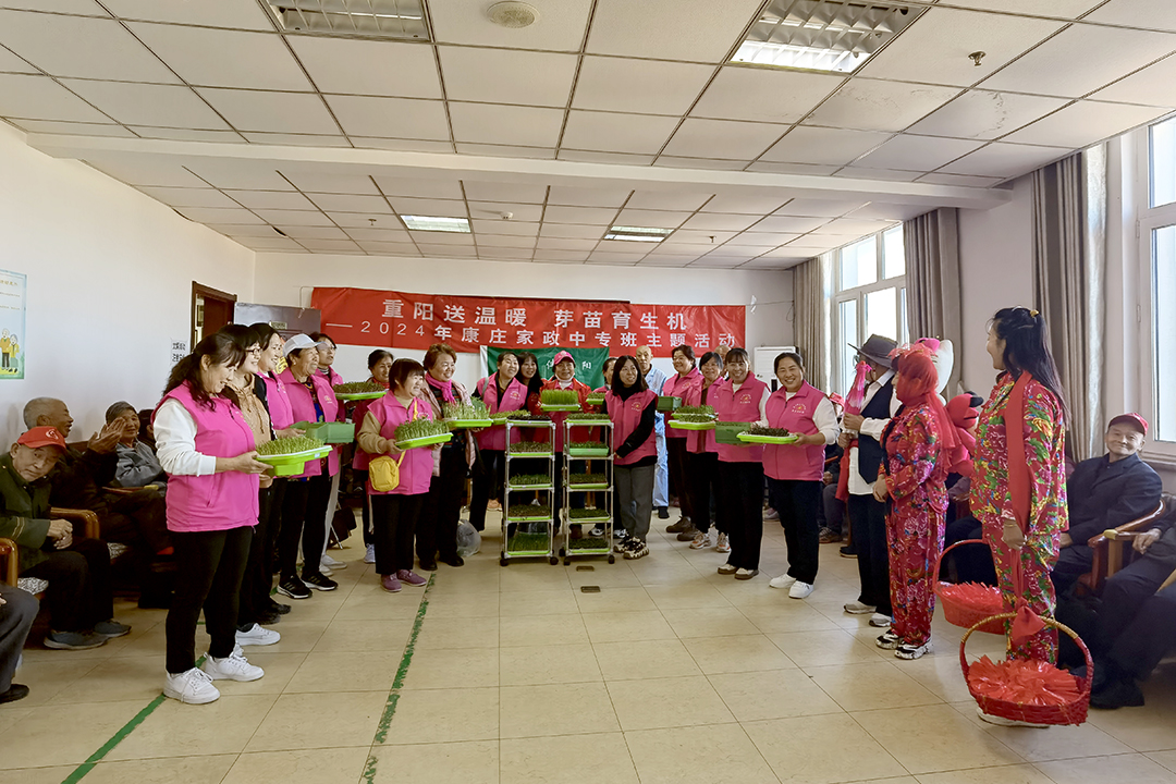 幸福食堂、“银发”追梦、别样“夕阳”……各班尊老敬老活动丰富多彩、喜庆祥和,让老年人感受到老有所乐、老有所养、老有所为。康庄家政服务与管理中专班,为老人们精心准备了学员栽种的7种芽苗菜和不同馅料的饺子,八达岭东曹营文艺中专班请来学院化妆老师为老人化妆,留下节日的纪念。除了歌曲演唱,老人们还自导自演了打快板、手语串烧、原创朗诵等节目。台上的老人笑容满面,热情表演,台下老人看得津津有味,掌声、笑声不断。