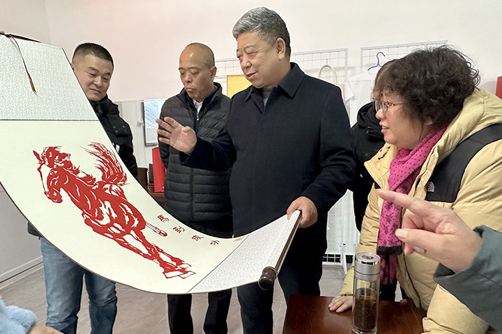 高佃亮向学员们介绍了蔚县剪纸的起源与发展脉络,并结合其创作的《骏马图》《五牛图》等作品,从构思、立意到呈现等多个维度进行了深入讲解。师生同台实践,沉浸式体验非遗教学,深切感受到蔚县剪纸独特的艺术魅力与文化内涵。高佃亮对学员的剪纸作品予以赞赏,鼓励大家精进技艺,不断提升作品的艺术性与思想性,结合村域旅游、民宿发展需求,力争创作出更多优质佳作。