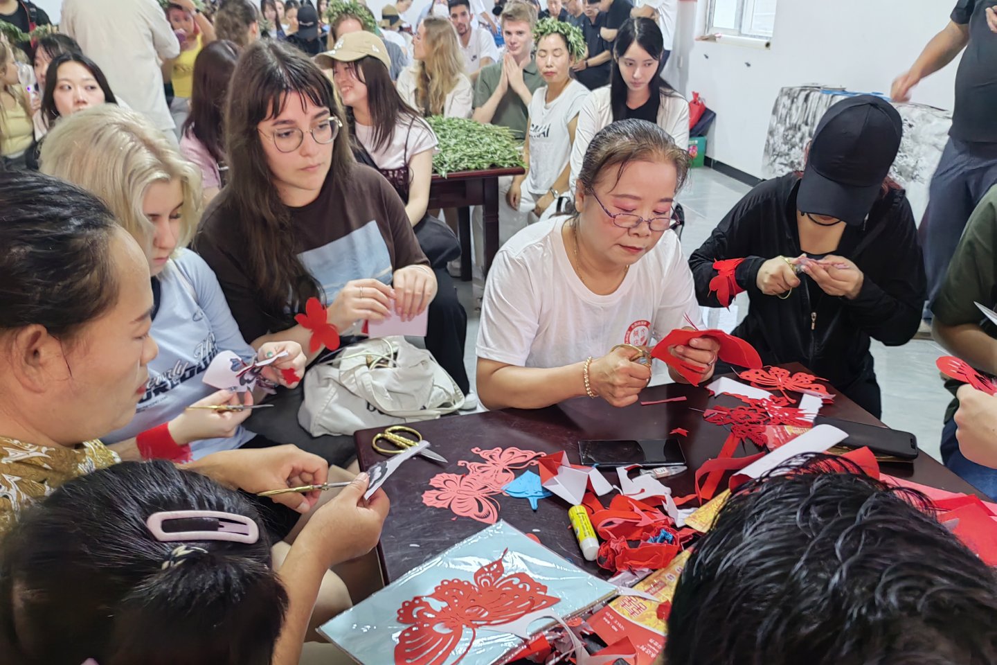 在农民中专班的实践课堂上,留学生们还亲身体验了中国传统技艺,学习传统书法、剪纸、艾草编织等技能。来自摩洛哥的女孩兴奋地展示自己的剪纸作品,介绍红纸边缘的锯齿纹路象征着文化纽带。留学生们对这些作品爱不释手,纷纷动手尝试,希望把这份独特的中国记忆带回家。