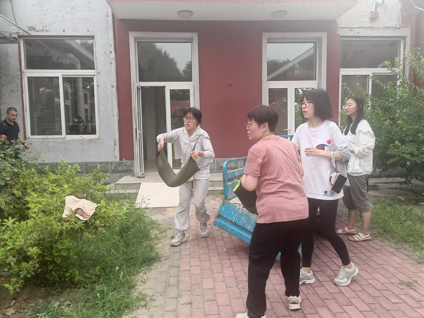 活动当天,支部全体党员来到湖畔实训园实验实训室区域。在前期对实训室及周边环境进行细致全面防汛隐患排查的基础上,支部聚焦防范雨水倒灌风险,将本次活动的重点放在关键部位——实训室门口的防汛沙袋布设上。党员同志们分工协作,默契配合,将预先准备好的防汛沙袋搬运至指定位置,严格按照要求整齐堆放在各实训室入口处,构筑起一道坚实的物理防线,有效提升了重点区域应对突发强降雨的能力。