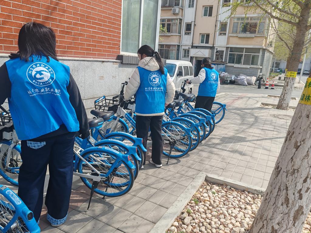 为维护校园周边秩序,我院学生会自发组织志愿者在校园及周边开展摆放共享单车活动。志愿者们身穿蓝色马甲不辞辛劳,严格按照车头一致、排列整齐的标准,将随意停放的单车规范摆放,有效改善了校园及周边单车停放乱象。