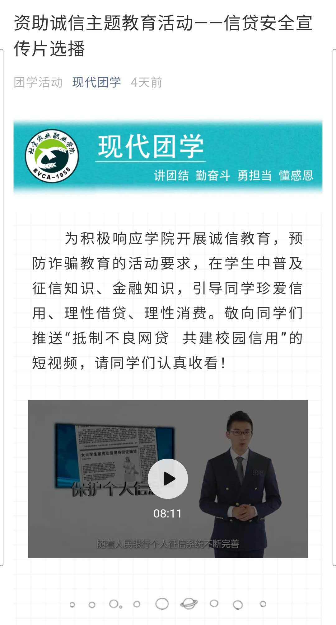 此次活动积极发动辅导员、班主任和学生会,创新了工作形式,充分利用现代团学微信公众号、企业微信组织开展了“诚信笃行 立德树人”为主题的作品征集活动、信贷安全宣传片选播活动和资助诚信主题教育班会活动,内容比较丰富。同时活动取得了很好的成效,共收集作品32份,全系300余名学生观看了信贷安全宣传片,15个班级组织开展了资助诚信主题教育班会。