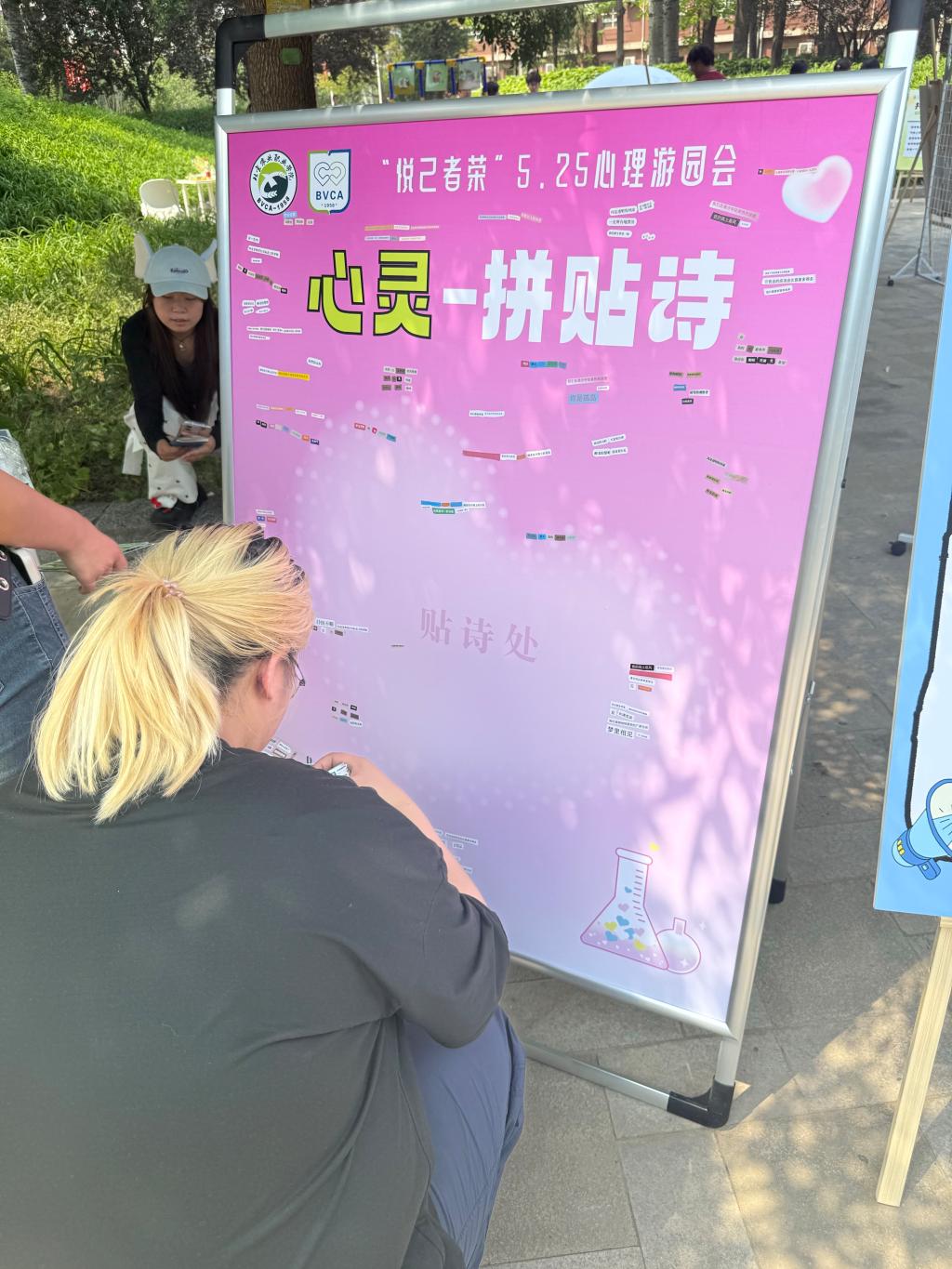 在绿树环绕的场地中,和大家一起布置、互动,看到同学们因我们的努力露出笑容,深感温暖。“5.25”心理健康季的温暖氛围中,我们拉近了与彼此的距离,捕捉了那些幸福快乐的瞬间,传递了快乐与温暖,为他人驱散阴霾,点亮心灵微光。