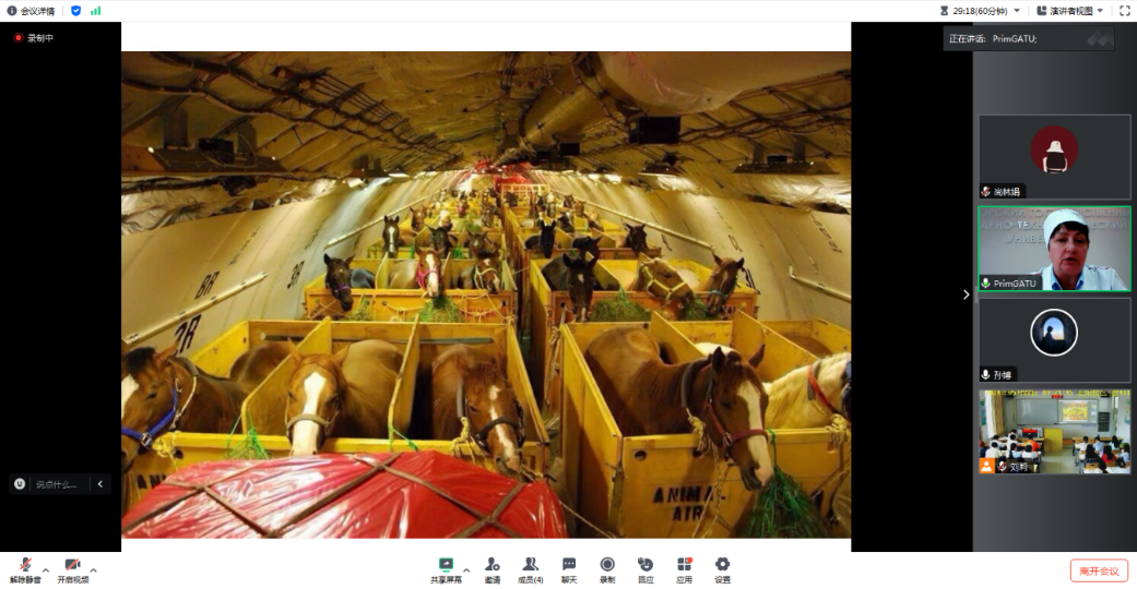 beat365动物科技学院王志副教授以“马匹运输应激综合症”为题,为两校师生从实践应用角度出发,详细介绍了马匹运输应激概念、病因及发病机制、临床症状、诊断、并发症、治疗和如何预防等。俄罗斯滨海国立农业技术大学博士Lyubchenko Elena从俄罗斯马匹运输检疫、兽医证书种类、马匹进出口等方面进行了交流。交流过程中,师生们就相关内容进行了探讨。