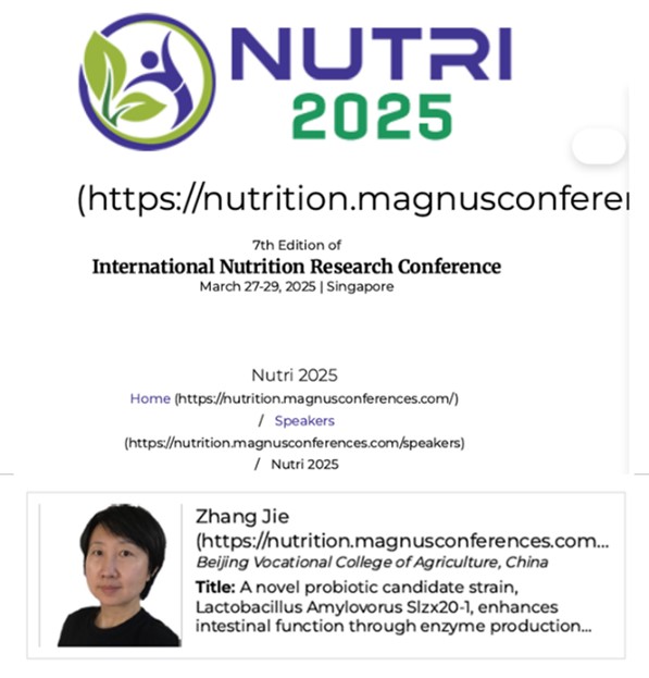 2025年3月27-29日,第七届国际营养研究会议暨第三届益生菌与益生元国际会议(Nutri and Probiotics 2025)在新加坡樟宜举行。会议分为27-28日的线下会议和29日的在线会议。beat365动物科技学院张洁教授受邀参加并作在线学术报告。