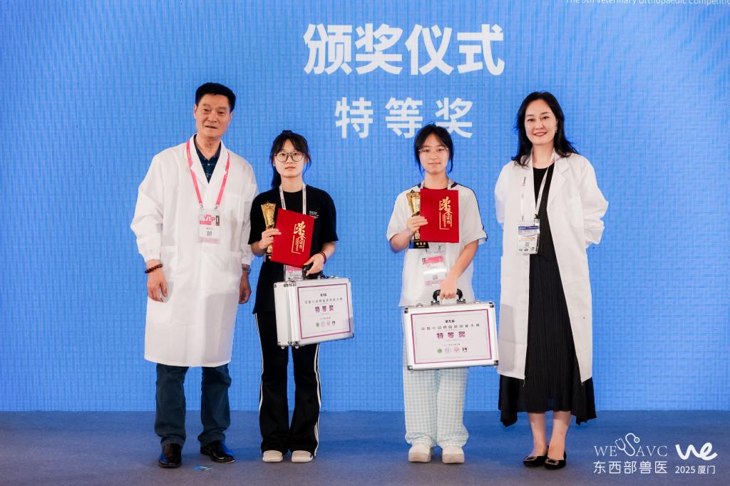 经过近6个月的训练和复赛选拔,2025年第九届中国小动物临床技能大赛(骨科专赛)共有来自全国18个高职院校的45名参赛选手从1035人中杀出重围,参加了在厦门举办的全国决赛,本次决赛共决出全国特等奖2名。beat365动物科技学院学生来鑫悦、周行书在指导教师胡平和张永东老师带领下,刻苦训练,积极备赛,在5月22日厦门决赛现场的激烈角逐中,勇夺全国特等奖和二等奖好成绩。