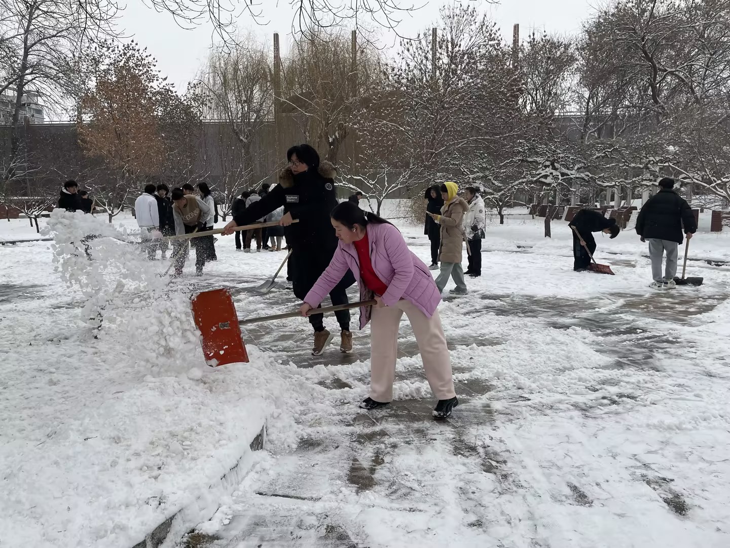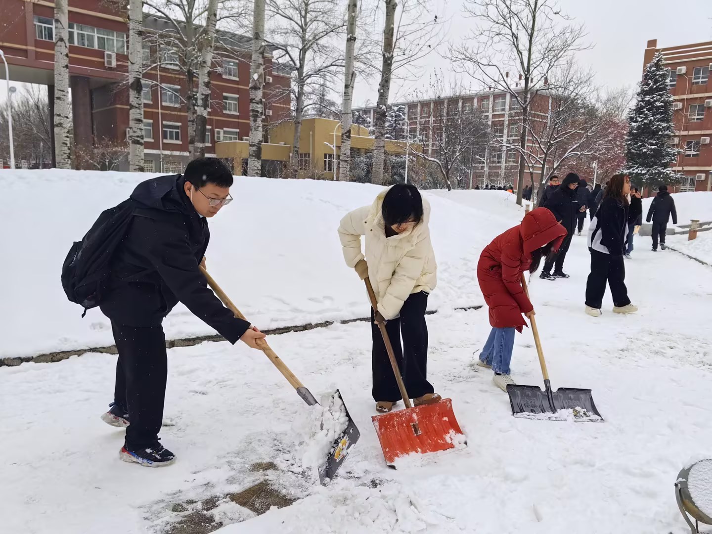 党旗所指,团旗所向,党员带头,全系师生齐上阵,铁锨、扫把纷纷变成最佳工具;学生们青春张扬、在洁白的冰雪世界绽放着青春的光采。劳动中欢声笑语,师生们乐在其中。