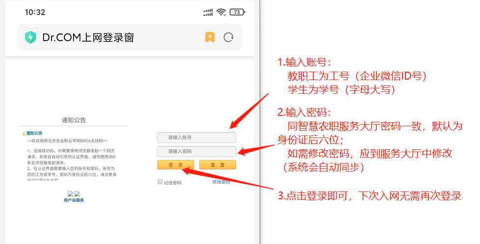 第一次使用BVCA的终端设备,需要完成用户身份认证后才能访问互联网。通过认证的终端设备,30天内在同一校区漫游都无需重新认证。