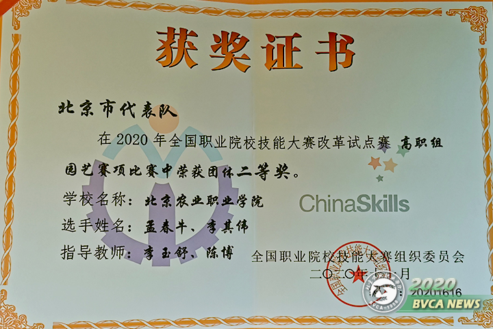11月6至10日,2020年全国职业院校技能大赛改革试点赛高职组园艺赛项在山东潍坊举行,共有28所院校28支队伍的56名参赛选手同台竞技。经过激烈的角逐,我院园艺系园林技术专业李其伟、孟春牛同学代表北京队荣获全国第六名、团体二等奖,是北京队该赛项在国赛中取得的最好成绩,实现了历史性突破。