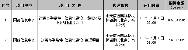现将我院进入招投标程序的项目在校园网上公示,欢迎监督。以下项目正在中国政府采购网、北京市政府采购网刊登招标公告。请相关人员按上述时间、地点准时参加开评标活动,参与项目的单位及人员务必遵守政府采购的法规、政策、程序,做到公开、公正、公平和透明。
